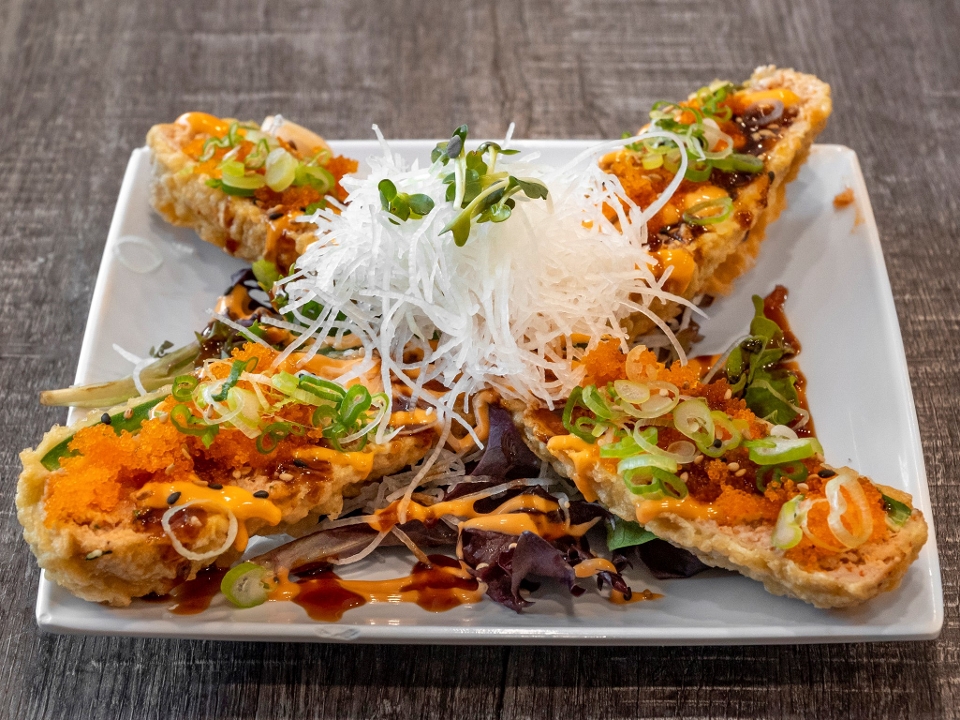 Spicy tuna mixed with white onion, jalapeño, masago, and mayo on top of crispy wontons with eel sauce and spicy mayo