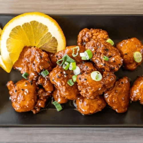 White chicken lightly coated with batter and deep fried, topped with home made orange honey sauce and sesame seed