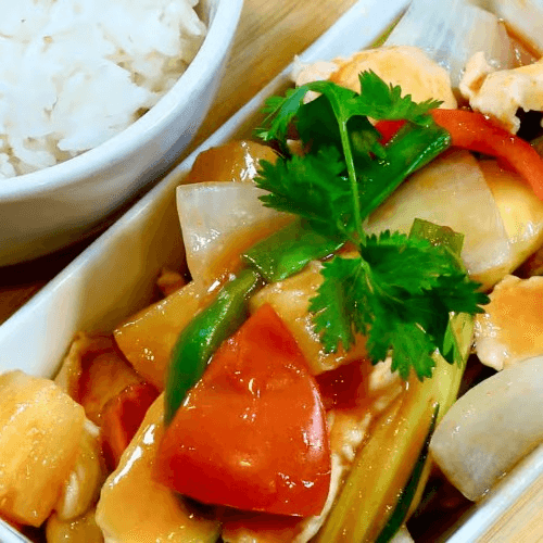 Stir fried with choice of protein, sweet and sour sauce, pineapple, onion, tomato and bell pepper