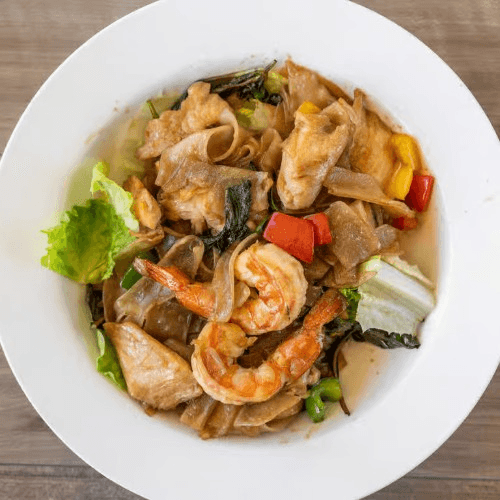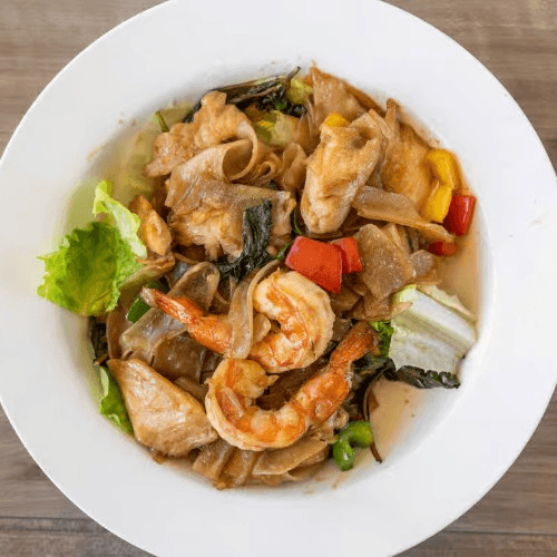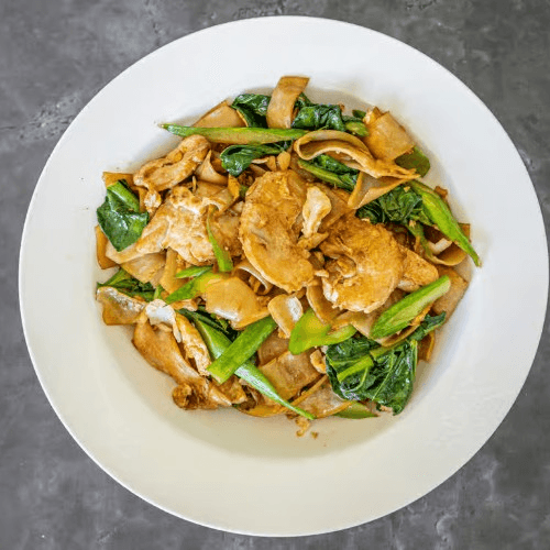Stir-fried fresh rice noodles with spicy chili peppers, sweet basil and fish sauce