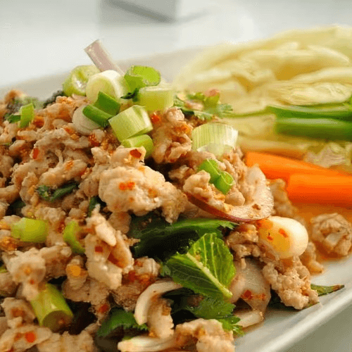 Northeastern Thai dish featuring your choice of ground chicken, ground pork or crispy chicken seasoned with red onion, lemongrass, mint, cilantro, fresh lime juice, roasted rice powder, fish sauce and crushed Thai pepper, served on top a bed of crisp lettuce
