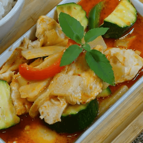 Red curry sauce and coconut milk mixed with zucchini, bell pepper, bamboo shoot and sweet basil