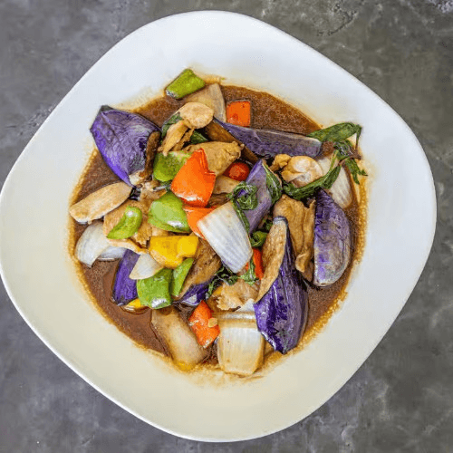 Stir fried with choice of protein, eggplant, garlic chili sauce, fresh sweet basil, bell pepper and onion
