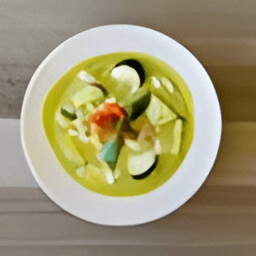 Green curry sauce and coconut milk mixed with zucchini, bell pepper, bamboo shoot and sweet basil