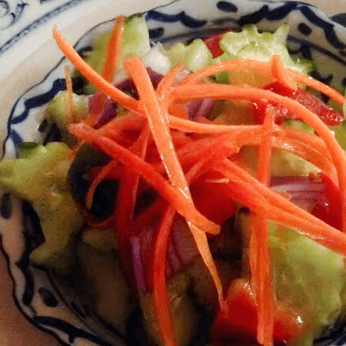 Zingy and spicy cold salad made with green papaya, long bean, cherry tomato, garlic, chili and dry shrimp. Dressing with palm sugar, tamarind sauce and lime juice, fish sauce