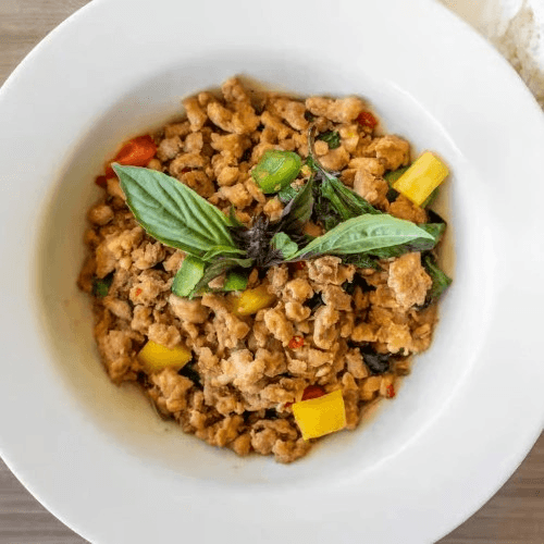 Stir fried with choice of protein, garlic chili sauce, fresh sweet basil, bell pepper and onion