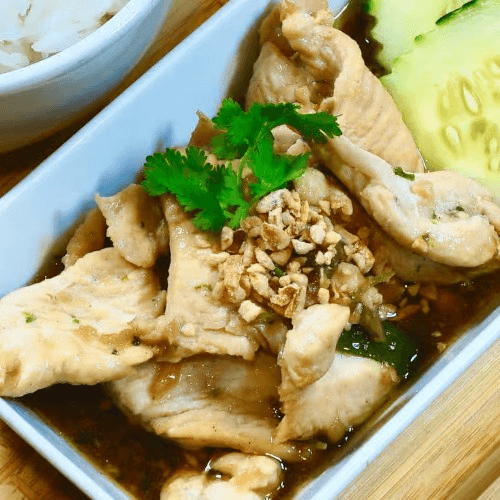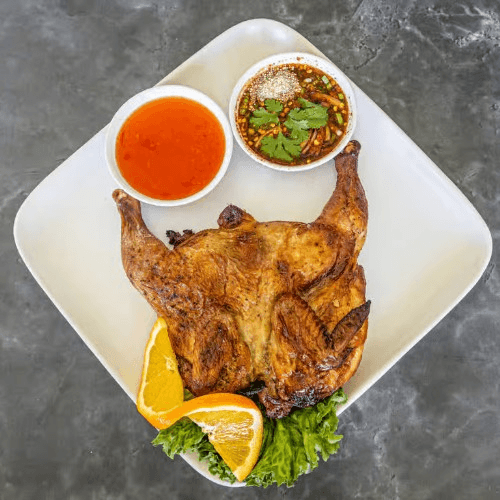 Halved chicken marinated with fresh garlic lemon glass sauce, then BBQ to perfection. Served on the side with sweet chili sauce and spicy tamarind fish sauce