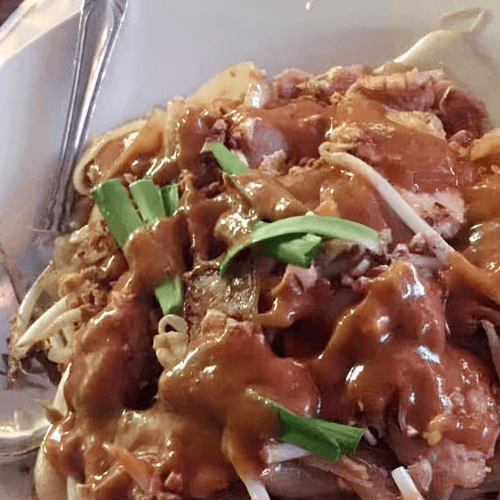 Rice-flat noodles pan-fried with beansprouts, chive, and lettuce