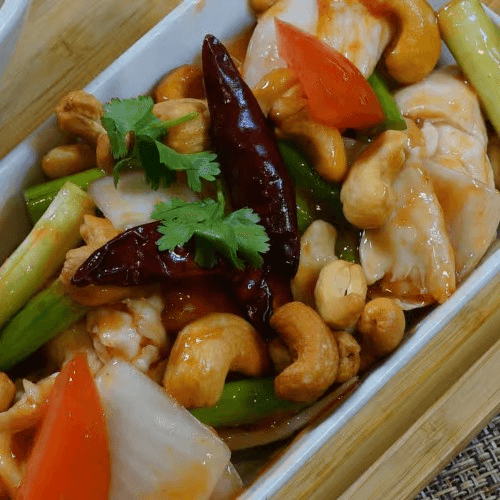 Stir fried with choice of protein, cashew nuts, onion, bell pepper and dried peppers