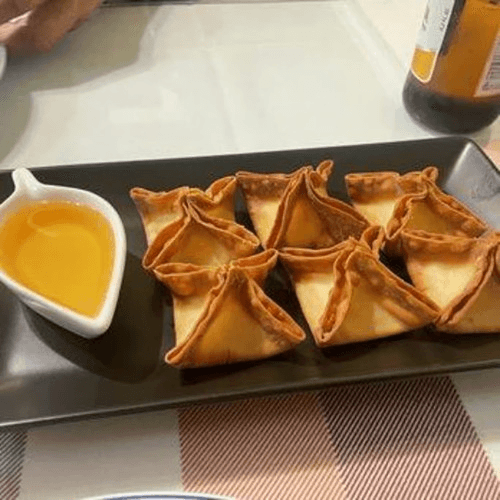 Imitation crab meat mixed with cream cheese and seasoning, then folded into wonton wrapper, deep fried to a golden brown, served with sweet and sour sauce