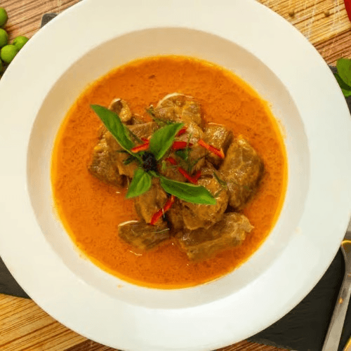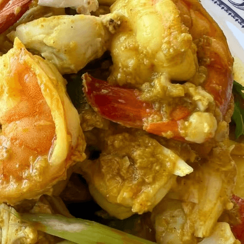 Combination seafood simmered in rich creamy coconut red curry sauce, bell pepper and sweet basil