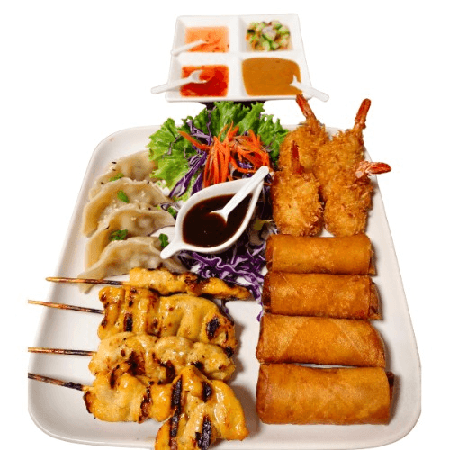 Contains four of each of the following: crispy egg roll, chicken satay, steam dumpling and coconut shrimp. (No substitute)
