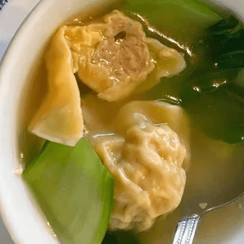 Large. Stuffed wontons filled with chicken and shrimp, simmered in the clear veggie broth, garnished with baby bok choy
