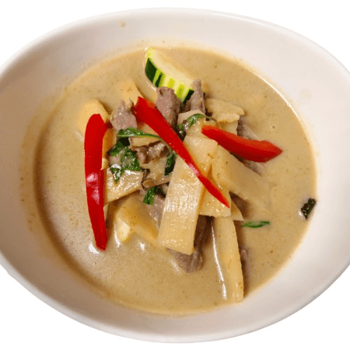 Panang curry paste in coconut milk, basil, bell peppers, zuchini, bamboo shoot, fresh chili