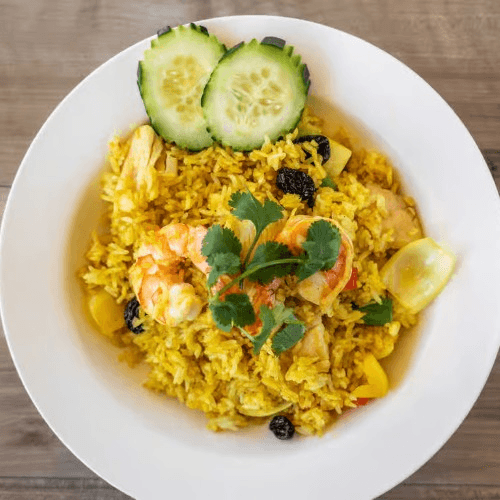 Tropical fried rice with sweet pineapple, cashew nuts, raisin, onion and bell pepper, spiced with a pinch of yellow curry powder