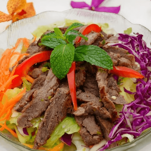 Grilled beef seasoned in our homemade sour and spicy sauce, mixed with red onion, cucumber, cherry tomato and mint, atop a spring mixed salad