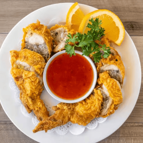 Deboned whole chicken wings stuffed with mushrooms and glass noodle, coated with batter and deep fried. Served with sweet plum sauce